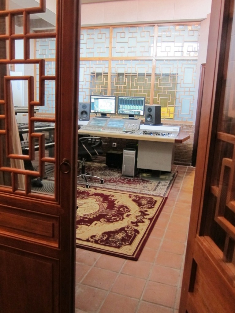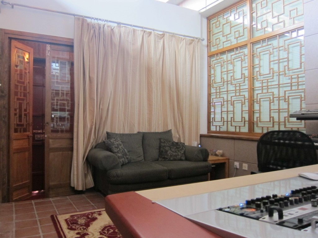 Since the studio is in a renovated traditional Chinese courtyard building, we were determined to keep the feeling that was originally there, which was quite a challenge acoustically as there is a lot of glass including a glass roof! But whatever wasn\’t perfected in design, we were able to compensate with sophisticated hardware/software system that corrects anomalies and imperfections in the room for my monitors.