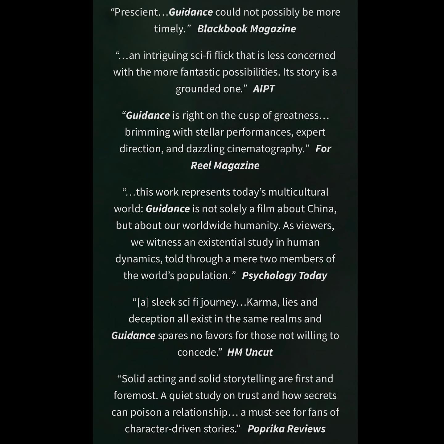 Since the launch of Chinese Sci Fi drama film ‘Guidance in the United States, Canada, Australia, UK, & 60 territories worldwide on all major platforms: Apple TV/iTunes, Amazon, Google Play, & more it has received very positive reviews.